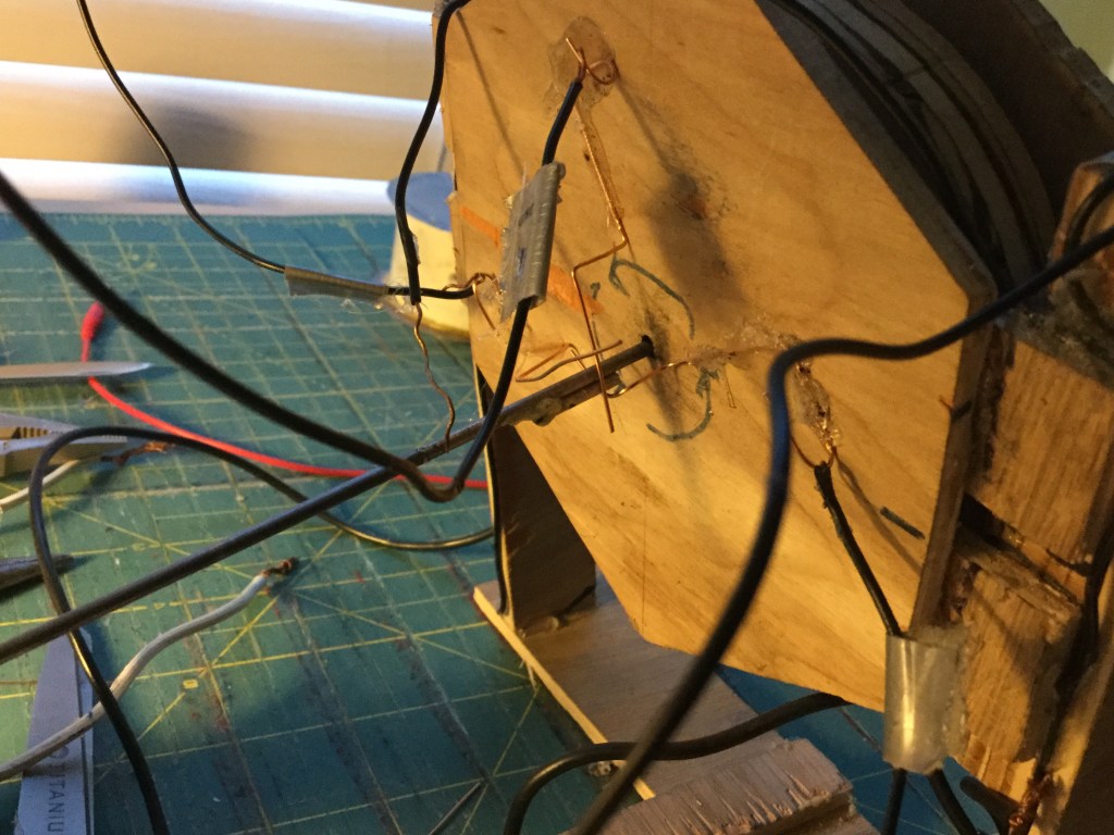 This commutator system had a lot of friction and just barely worked, so I played around with different designs. I remember trying to use a big cam and real micro switches at one point, but this also had too much friction.