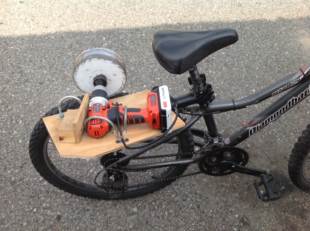 For the bike, the hole saw was bought specifically for that purpose. I can’t even imagine using that to drill a real hole (I’m assuming it’s just for drywall?). I remember we experimented with wrapping the outer surface of the hole saw in tape and inner tubes.