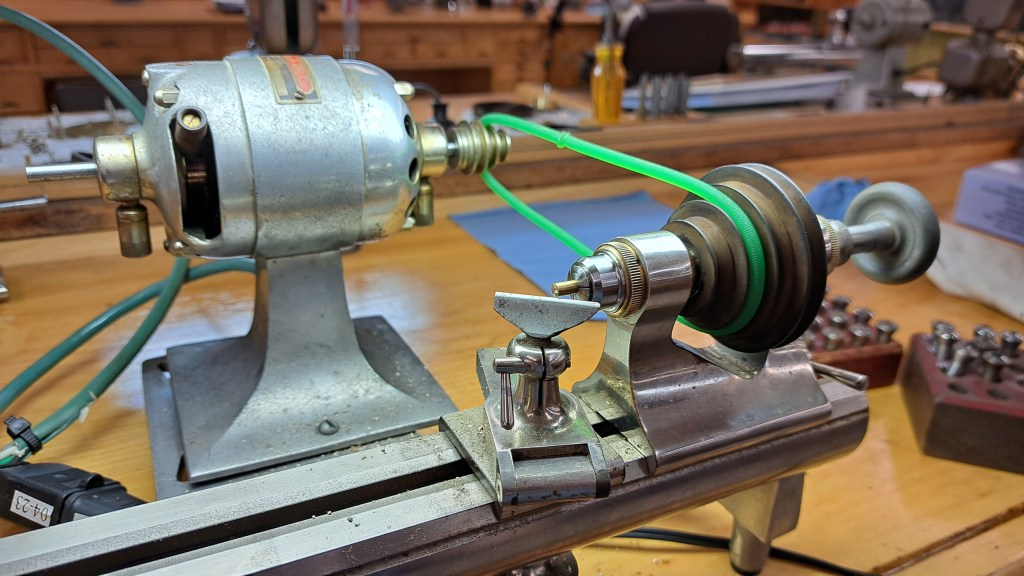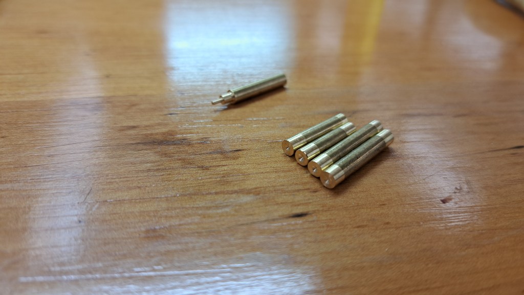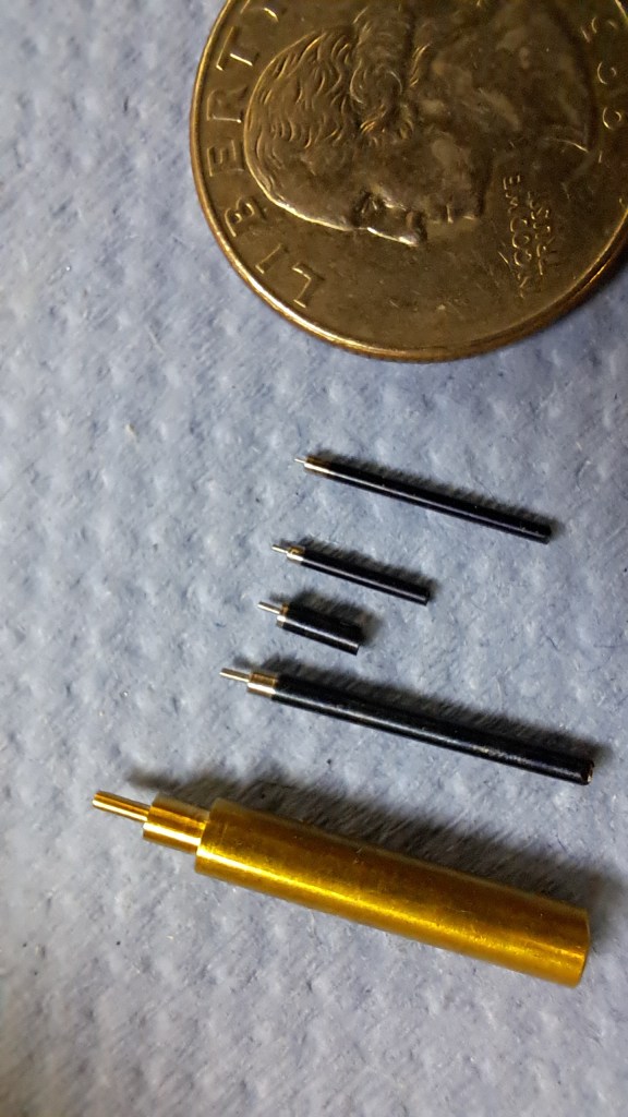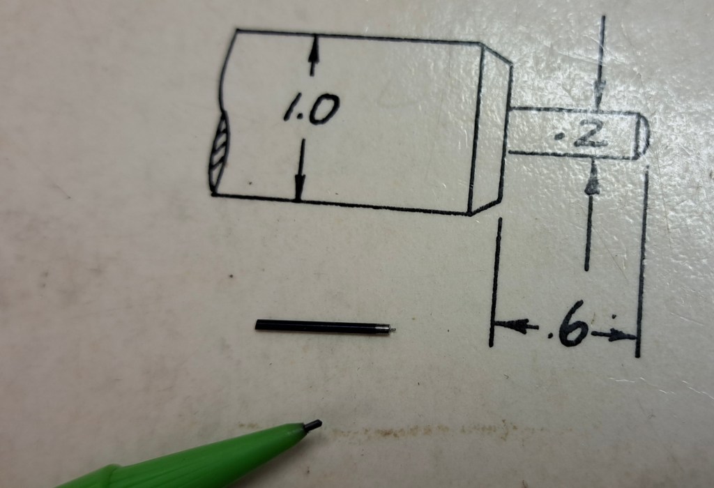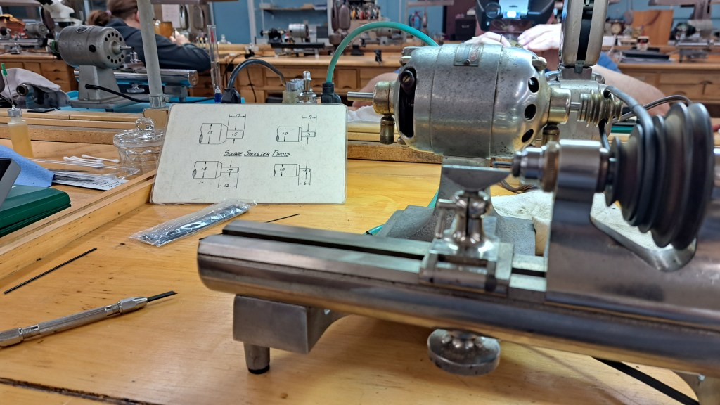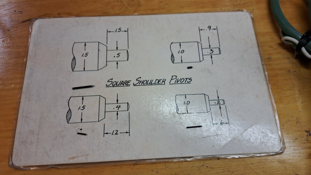To get familiar with the lathe and using hand gravers I was tasked with making some center pivots and also a square shoulder pivot. The center pivots are simply a small hole in the end that comes to a point exactly at the center – they are useful for acting as a pilot hole so that a drilling operation won’t wander, or could be used to prepare the end for riveting.