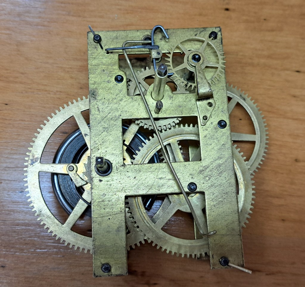 This is an American time-only clock movement. It’s very simple because it only gives hour and minute, no bells or whistles.