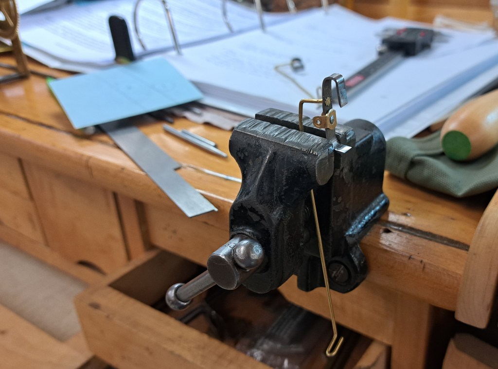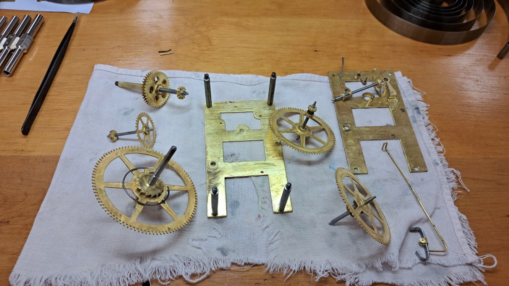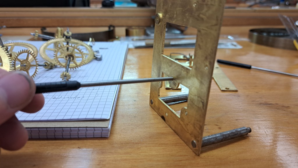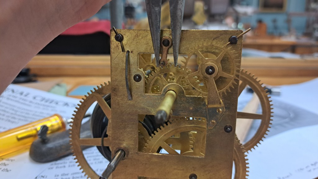 At last it ran smoothly with not too much “drop” (free rotation of the escapement wheel) and an even beat. The escapement wheel is slightly out of round, so it was impossible to get a perfect tick-tock, but it runs pretty well!