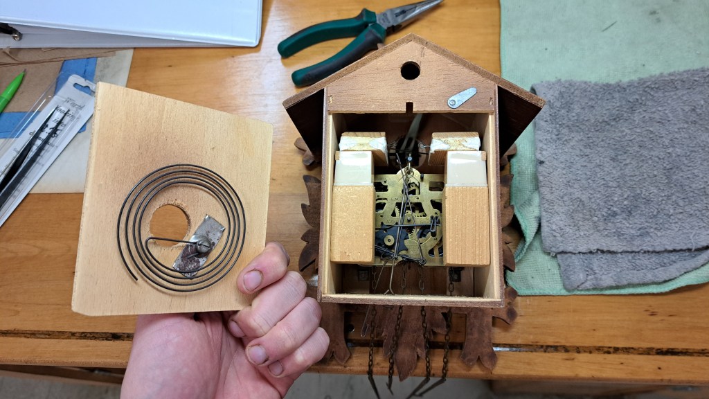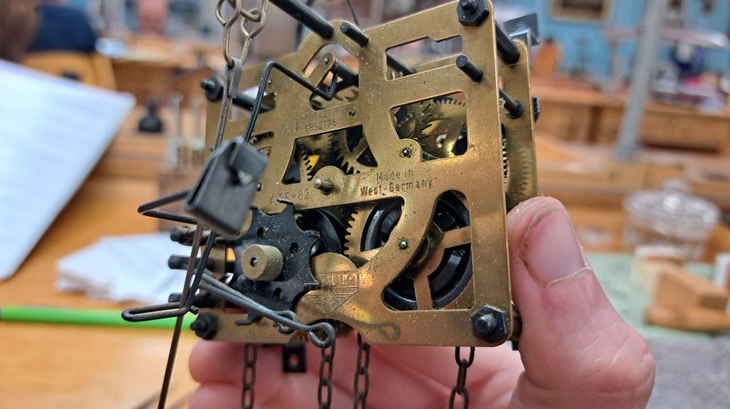 Here’s a charming little clock. It’s a fairly simple cuckoo clock with a 1 day, 2 weight “Regula” movement that needed a bit of cleaning and servicing to get it singing again.