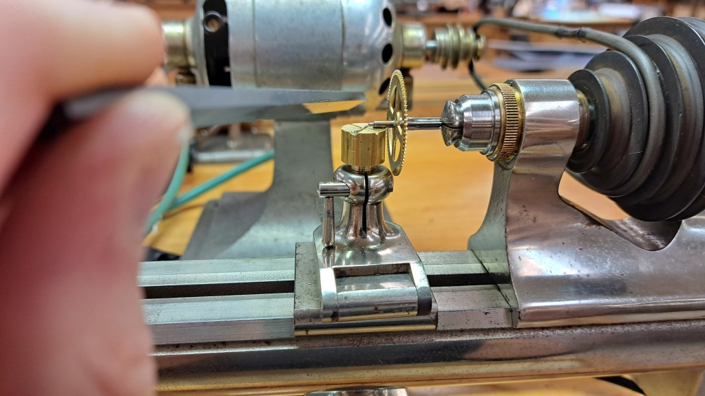 Back to the clock, I polished all the pivots in a watchmakers lathe: