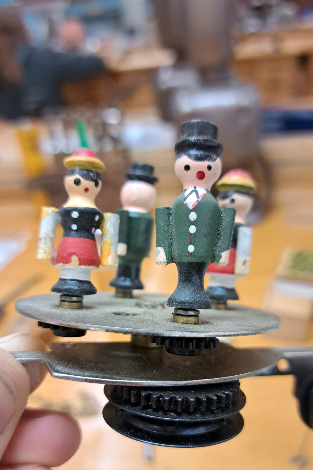 In this variation the cuckoo clock movement again triggers a music box mechanism, but this mechanism operates a turntable platform with rotating ‘dancing’ figures rather than just one simple figurine. The turntable has a sort of planetary gear arrangement on it and a sprocket that accepts a chain which is connected to the music box assembly.