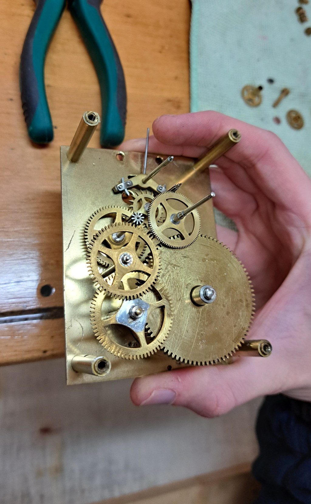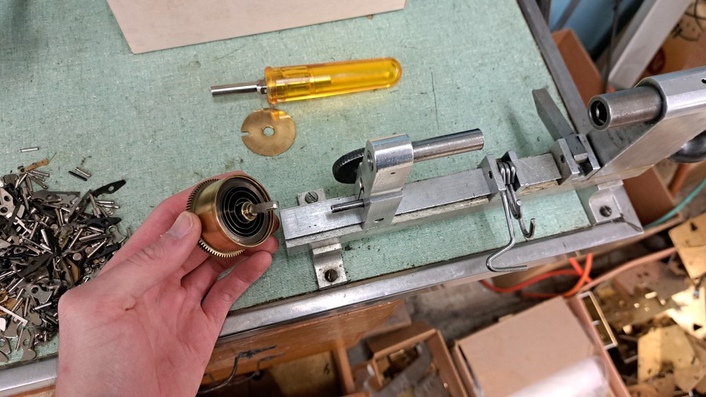 First I disassembled it. The movement really is simple, just one gear train from the mainspring barrel to the escapement.