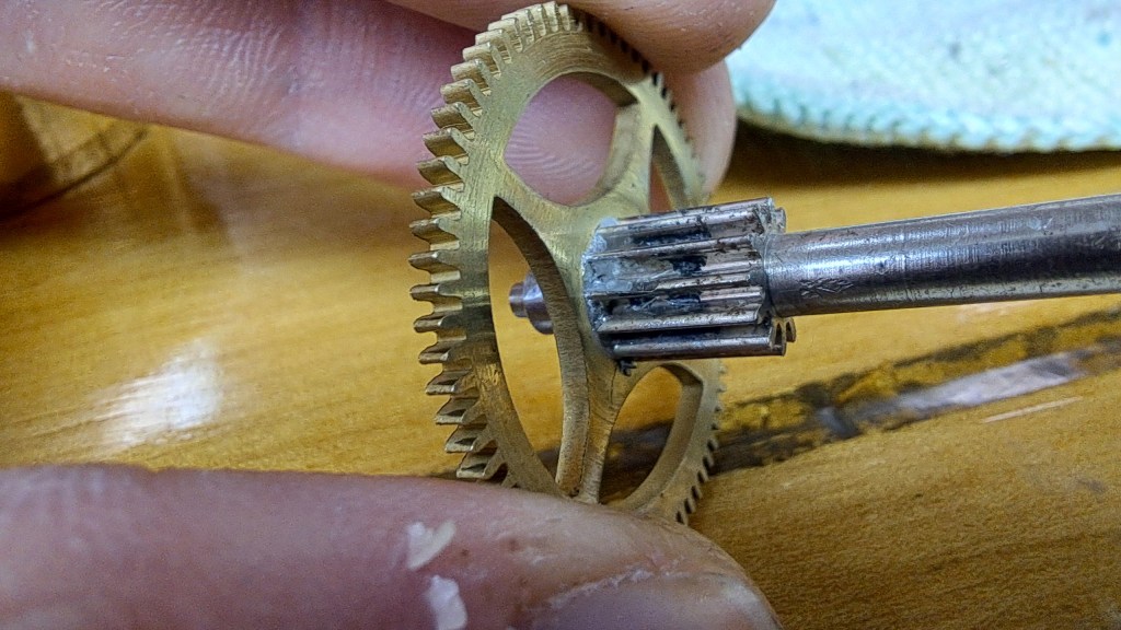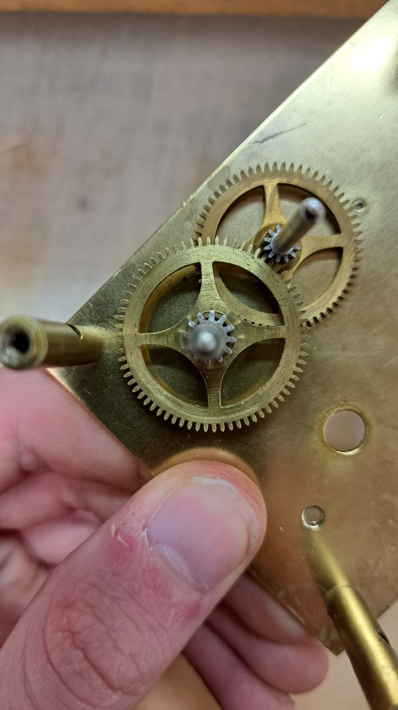 The replacement wheel came from a clock that was also in need of repair, and it turned out that this wheel was again the issue – though this time it was much easier to fix. One of the teeth was bent slightly and caused friction; in the photo, the guilty tooth it is on the lower wheel but toward the top of it, 2 or 3 teeth to the left of the pinion. I carefully bent it back and checked it ran smooth.