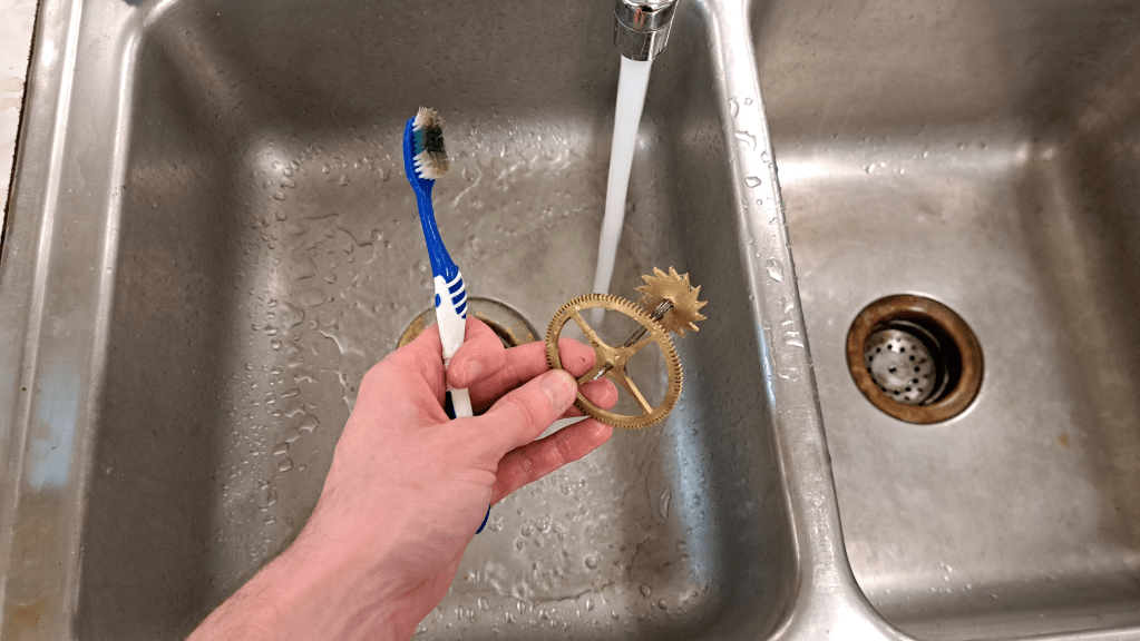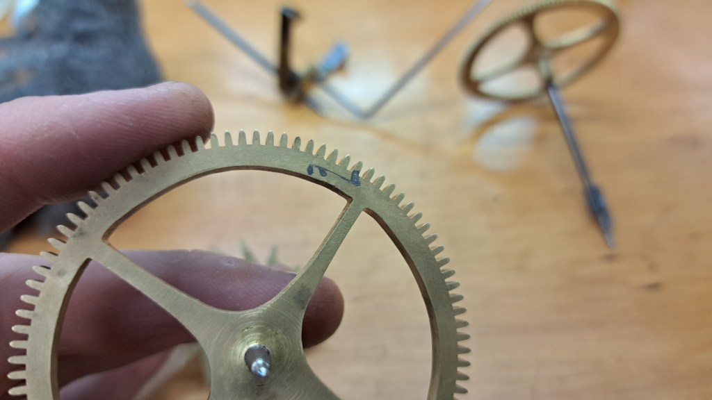 While doing that I noticed I’m not the first to give this clock some love and care. Someone replaced some teeth on the above wheel by cutting out a dovetail shape, soldering in a new piece, and filing in new teeth profiles. I have a post about that process here.