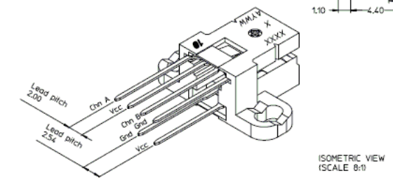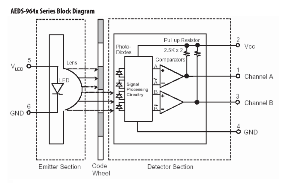 The encoder has a an LED that sends light to 2 photo-diodes. Those photo-diodes give a “high” signal when they receive light (in the translucent parts of the strip), but give a “low” signal when there is no light (in the opaque parts of the strip) – they’re kinda like little solar panels. Although in this sensor there are 2 photo-diodes to record not just velocity but also direction, I will only be probing 1 of them as I only have 1 probe for my scope.