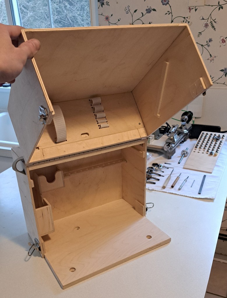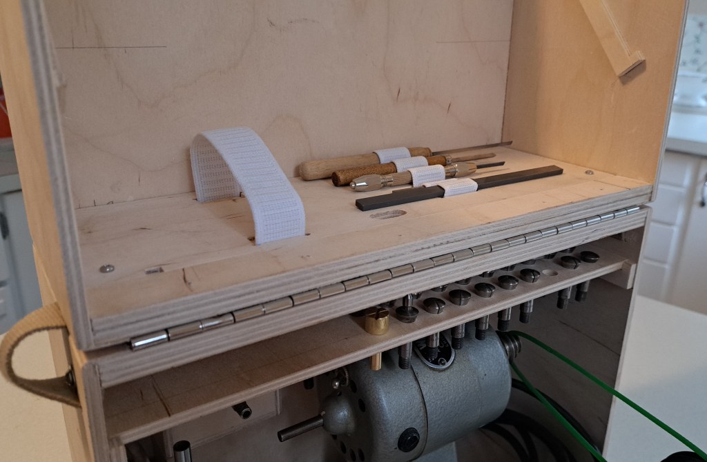 I gave the watchmakers face plate and the three-jaw chuck their each little pocket. I’m chuffed with how these turned out! And some other attachments sit in the back.