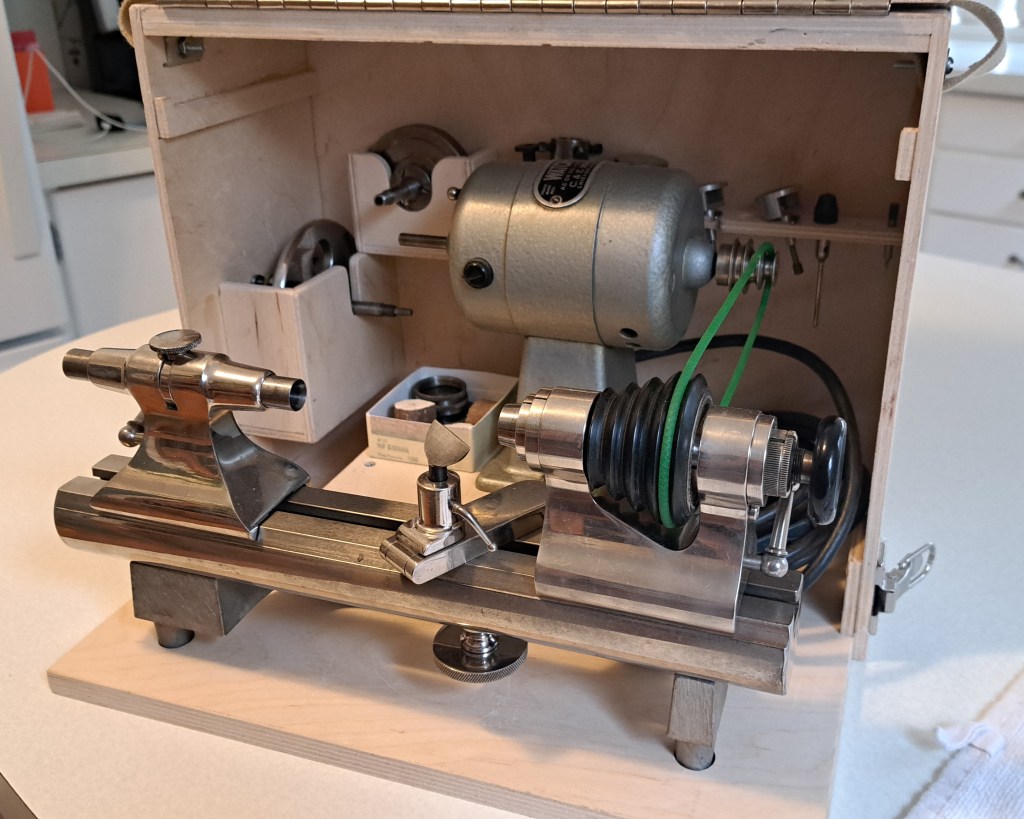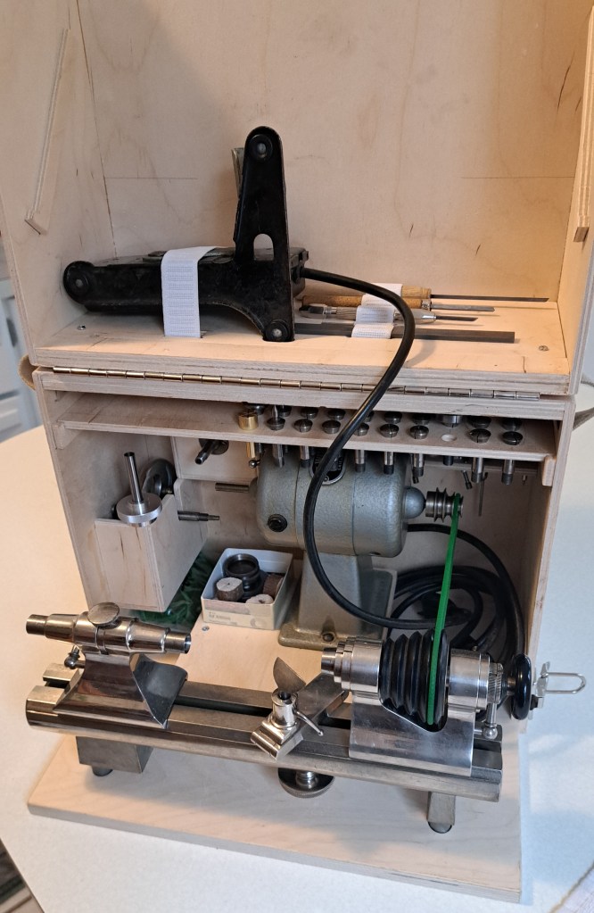 Here’s the lathe – an 8mm Marshall, which I set up for left-handed use – various chucks, collets, gravers, and the foot pedal.