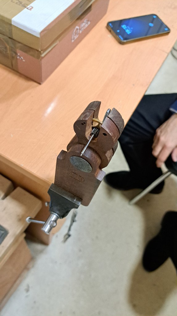 A very nice clockmaker showed me a tool I’d never seen before: a vice for holding clock wheels to easily work on them.