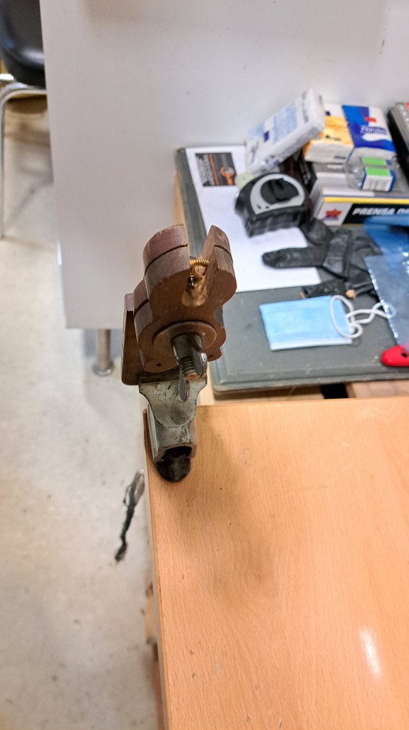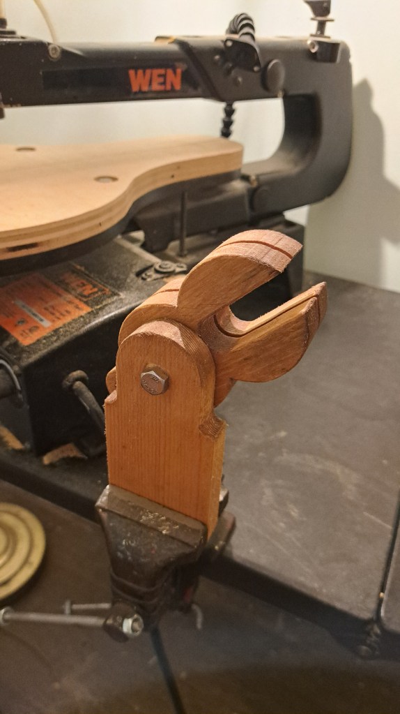 Then I cut those out on the scroll saw, drilled the holes, and found a good bolt to be the central pin and provide the clamping force.