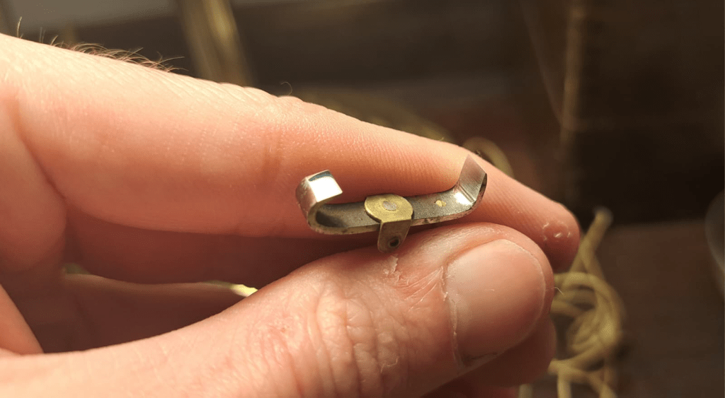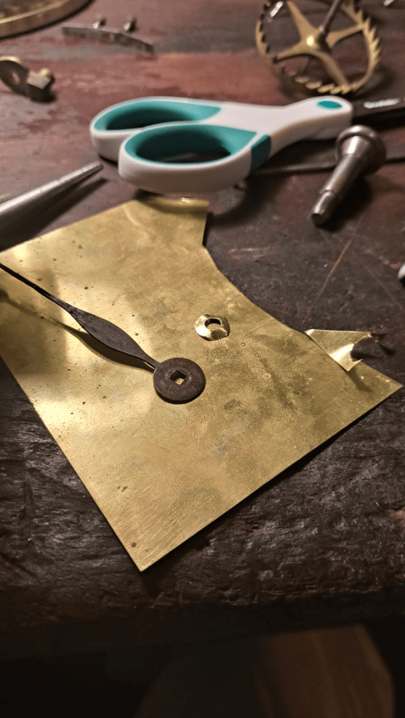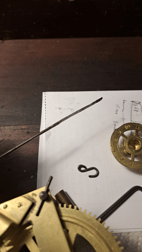 Finally I had some finishing touches to attend to. It was missing the cupped washer that holds the minute hand tightly. I do not have any on-stock; instead I made one from a sheet of brass. It was also missing a weight hook, so I made one using a nail (not pictured).