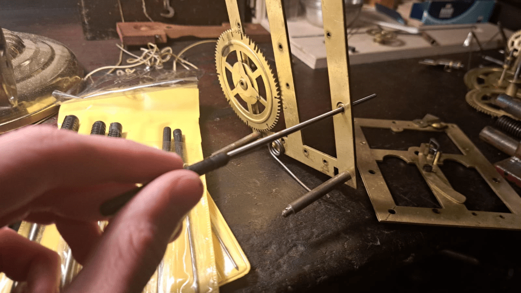 Next I polished the pivots on the watchmakers lathe (left), and smoothed the pivot holes with smoothing broaches (right).
